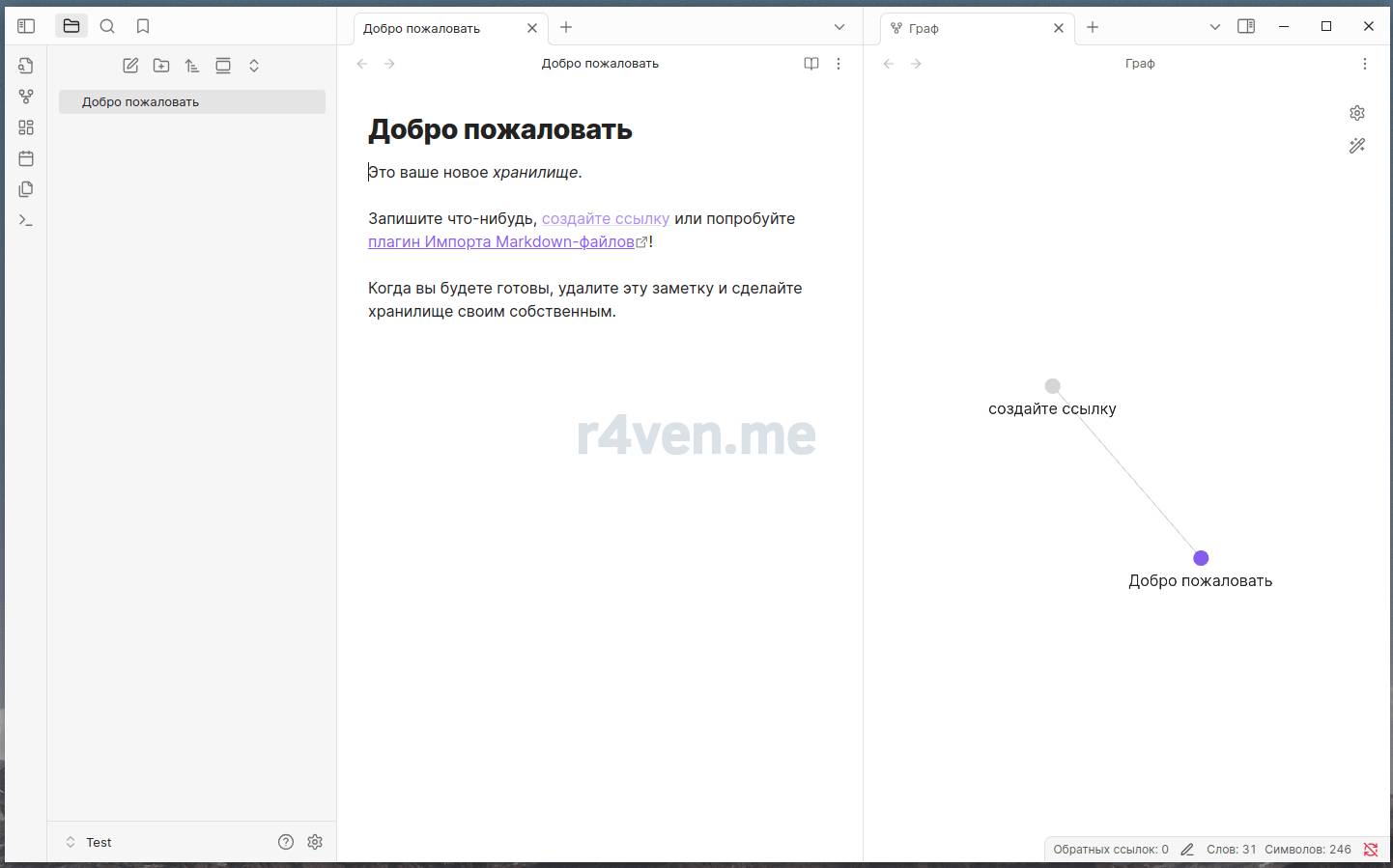 Итак, перед нами основное окно программы Obsidian: слева древовидная панель с директориями и заметками, справа область редактирования/просмотра заметки. Программа имеет возможность работы с вкладками, а также открытие нескольких заметок рядом друг с другом в разных областях, в которых могут быть свои вкладки: