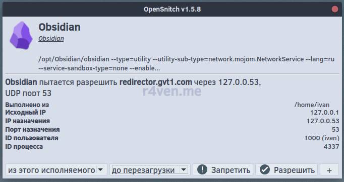 ⚠️Т.к. Obsidian является закрытым ПО, то рекомендую уделять больше вниманию его поведению, например отслеживать сетевую активность с помощью OpenSnitch: