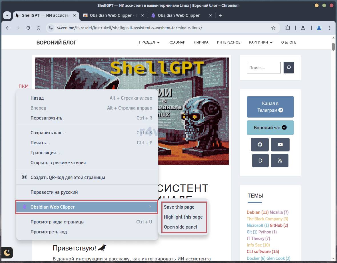 Теперь просто переходим на нужную вам страницу в интернете, далее нажимаем на кнопку самого расширения и после Добавить в Obsidian: