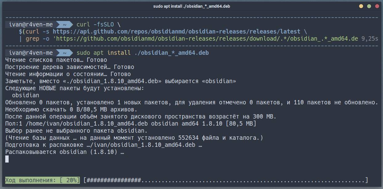 💡В команде curl используется механизм подстановки командной строки. Т.е. основной команде на скачивание: curl -fsSLO передается аргумент, который является результатом выполнения другой команды внутри конструкции $(command), выполняющейся предварительно. В итоге основная команда получит прямой URL на .deb файл последнего релиза Obsidian из GitHub. Команда универсальна.