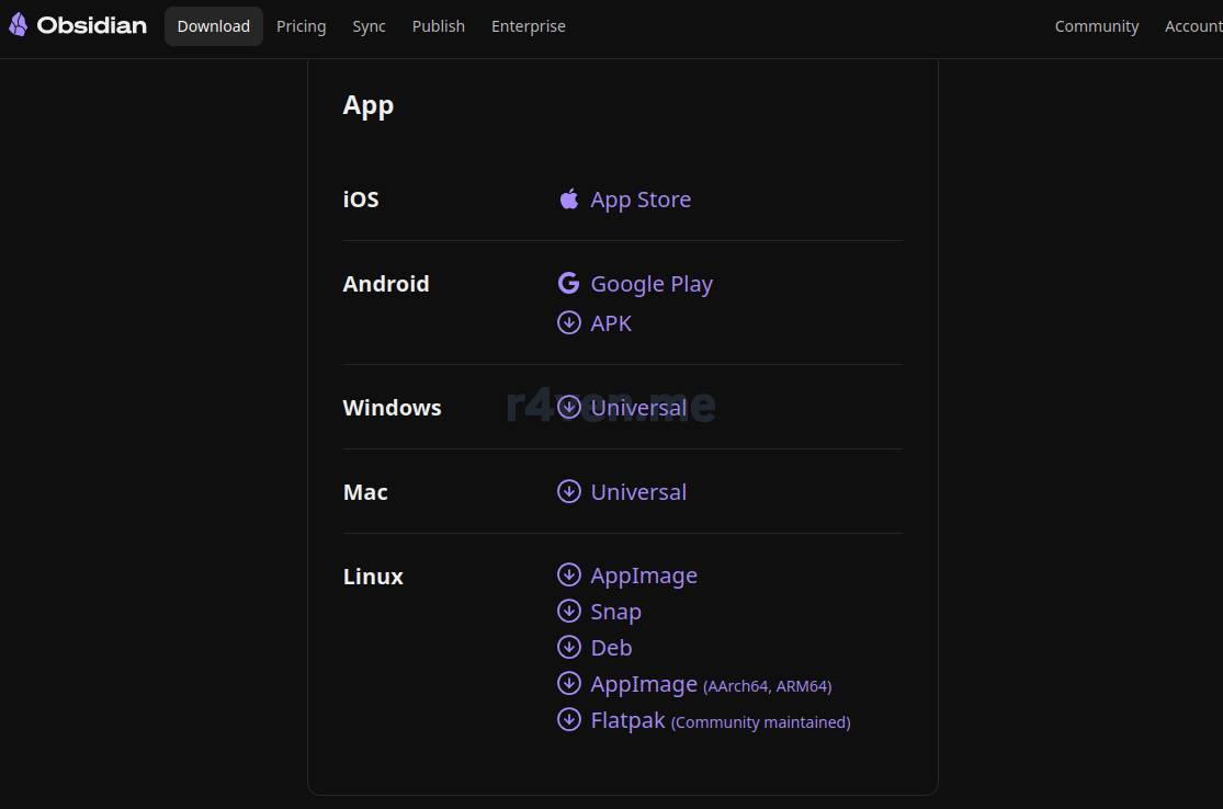 Как уже ранее сказал, Obsidian доступен для разных платформ. Чтобы скачать установочный файла идём на страницу загрузки официального сайта: https://obsidian.md/download и выбираем подходящий вариант: