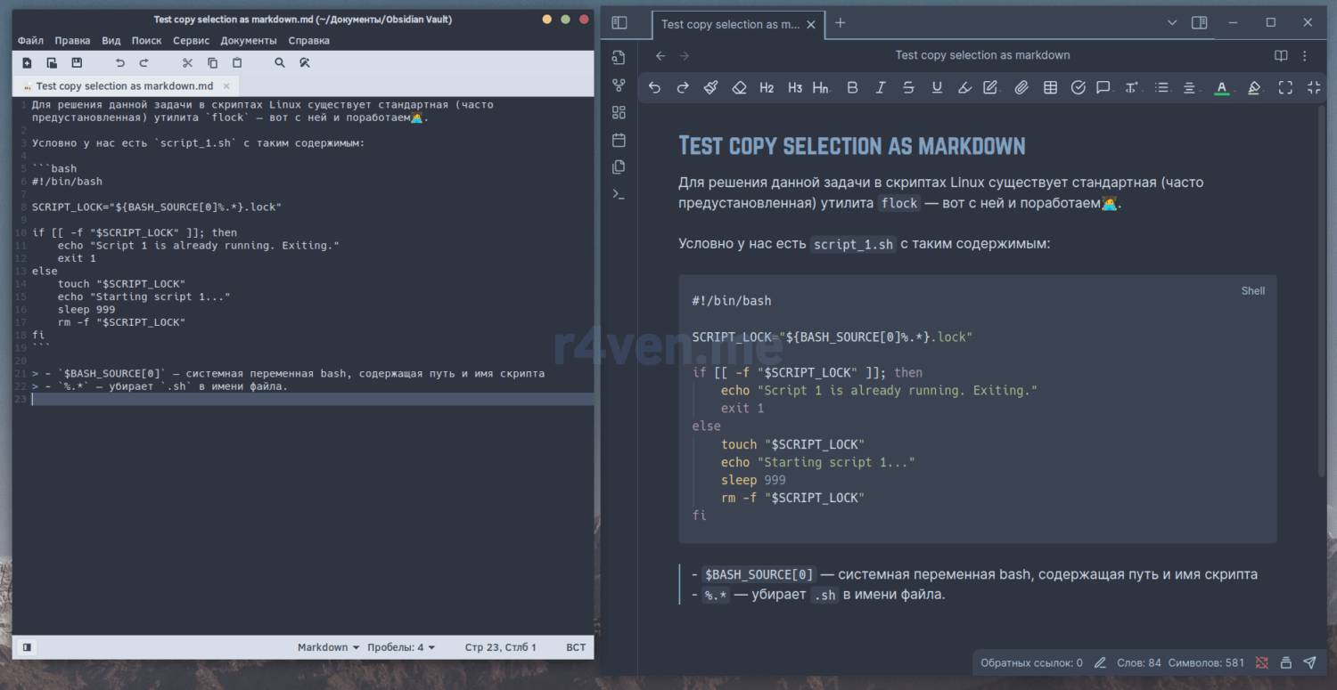 На изображении ниже показан пример «сырого» текста и его рендеринга в Obsidian: