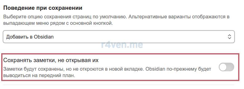 Если не хотите, чтобы Obsidian открывался каждый раз при добавлении заметки, а просто выполнялось сохранение в фоне, зайдите в параметры плагина и установите данный чекбокс: