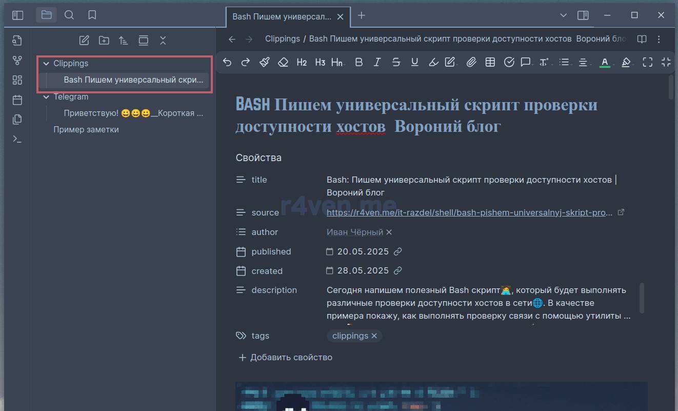 Откроется сохраненная заметка в формате Markdown с отображением некоторых метаданных (их можно отключить в настройках расширения):