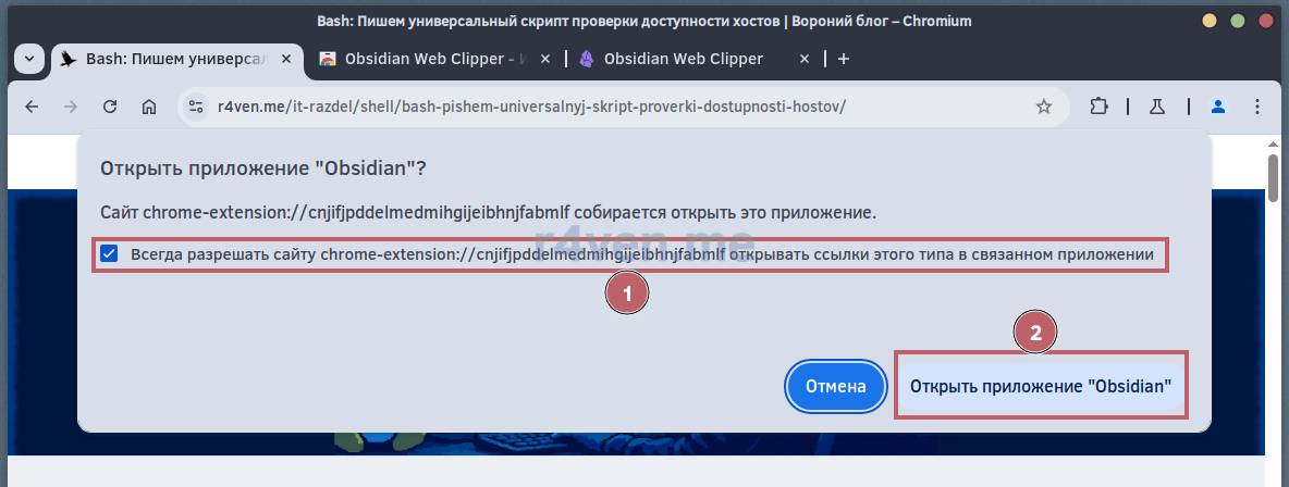 При первом использовании браузер покажет уведомление. Ставим чекбокс, чтобы не видеть его постоянно и затем нажимаем Открыть приложение «Obsidian»: