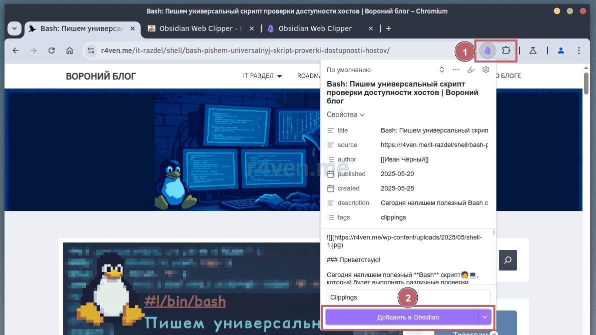 Оба расширения очень полезны, но в своей практике я больше пользуюсь вторым, т.к. мне не часто приходится сохранять что-то в браузере и не всегда в Obsidian.