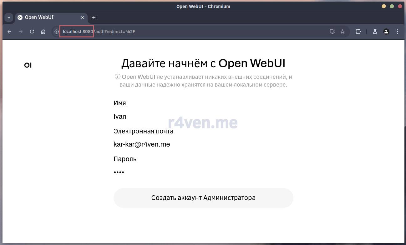 open-webui serveТеперь открываем браузер и переходим по адресу: http://localhost:8080. Задаем имя, почту и пароль администратора: