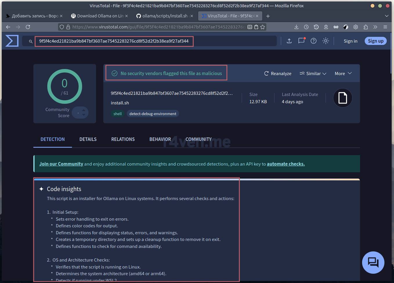 curl -fsSL https://raw.githubusercontent.com/ollama/ollama/main/scripts/install.sh | sha256sum3) Загрузка скрипта на бесплатный онлайн-сервис — VirusTotal, который проверяет файлы и ссылки на наличие вредоносного кода, вирусов, троянов, червей, шпионского ПО и прочих угроз.