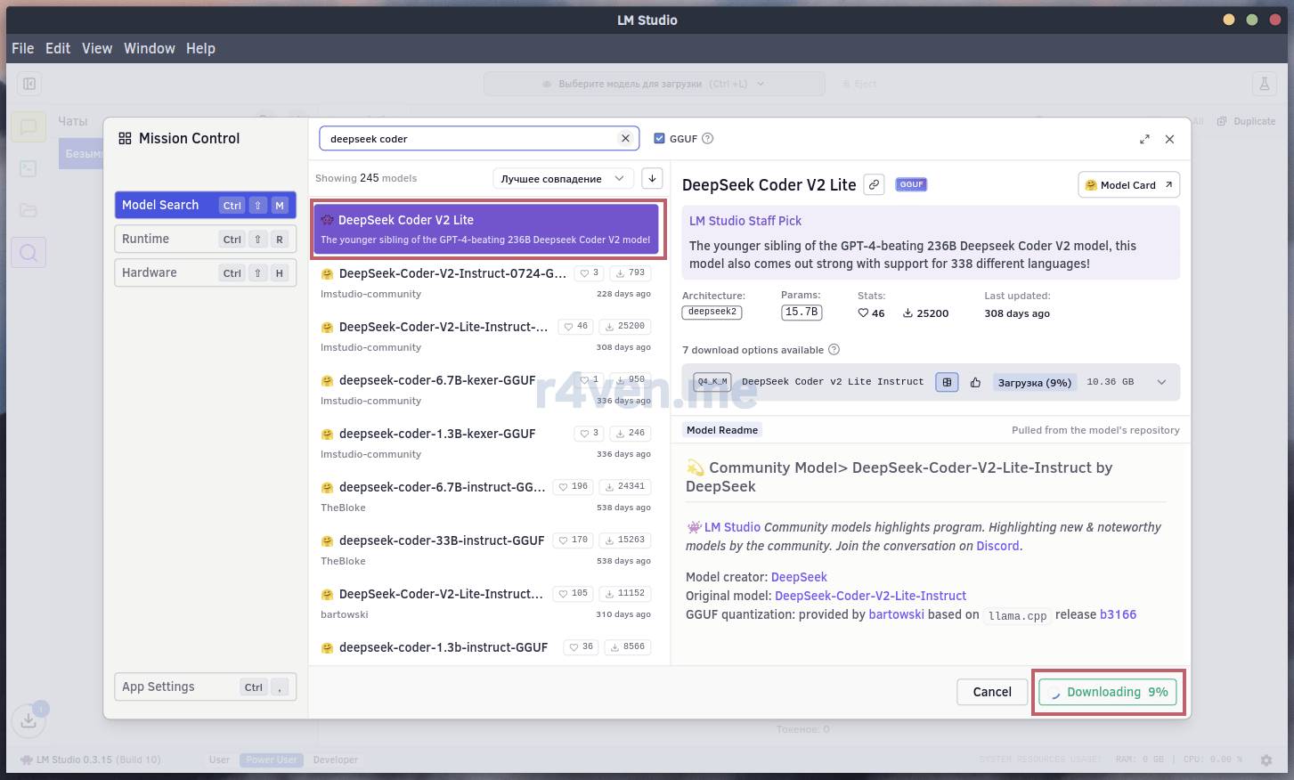 Вбиваем в поиске название нужной модели, в моем примере deepseek coder v2 lite: