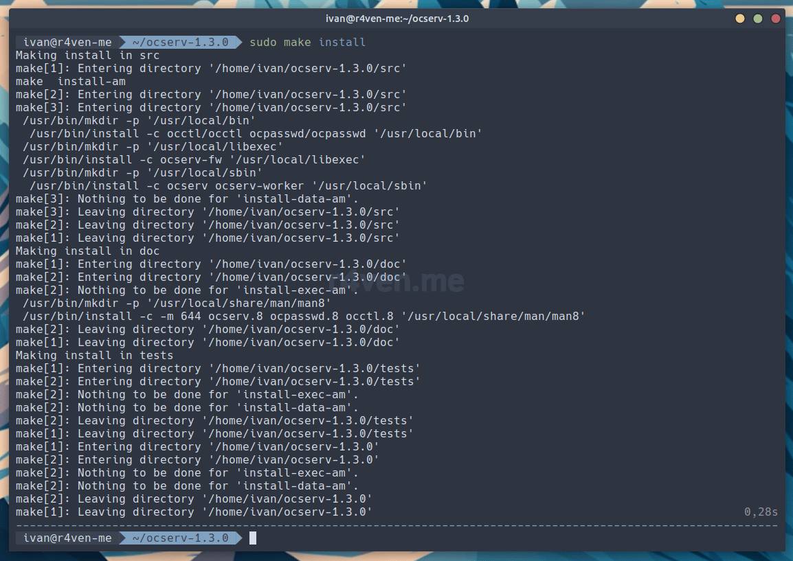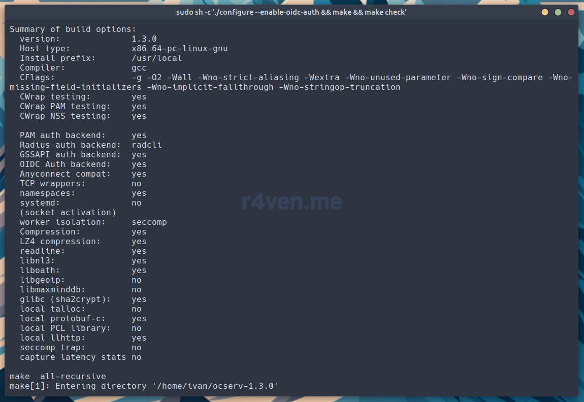 После распаковки переходим в созданную директорию с исходниками и запускаем сборку, а также проверку ocserv, и все это от имени root: