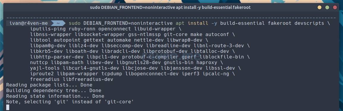 sudo DEBIAN_FRONTEND=noninteractive apt install -y build-essential fakeroot devscripts \