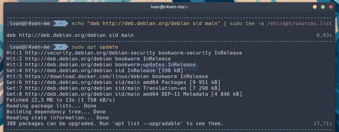 Далее подключаем репозиторий Debian Sid — репозиторий «нестабильных» пакетов дистрибутива, т.к. там находятся нужные нам версии библиотек. После, обязательно обновляем кэш для применения изменений: