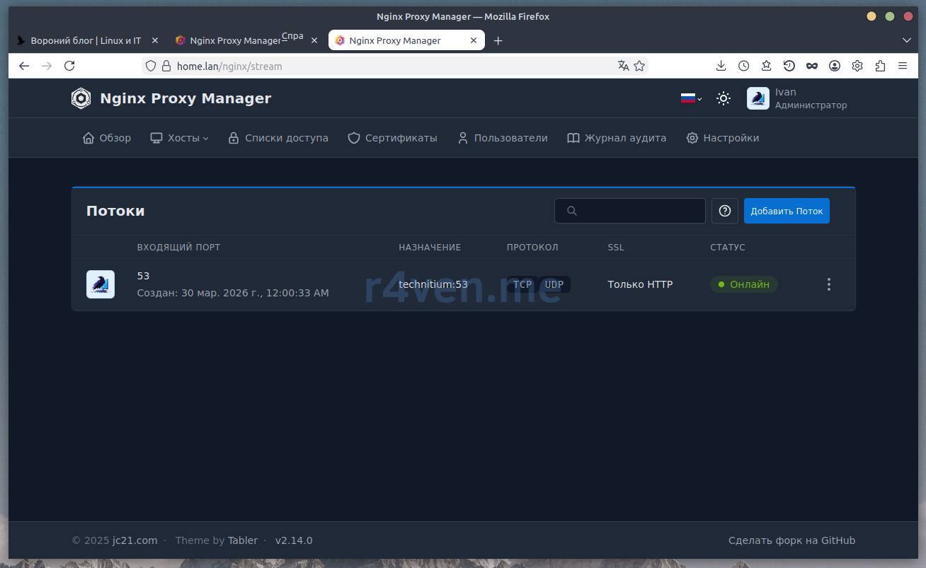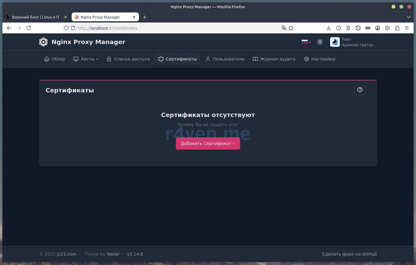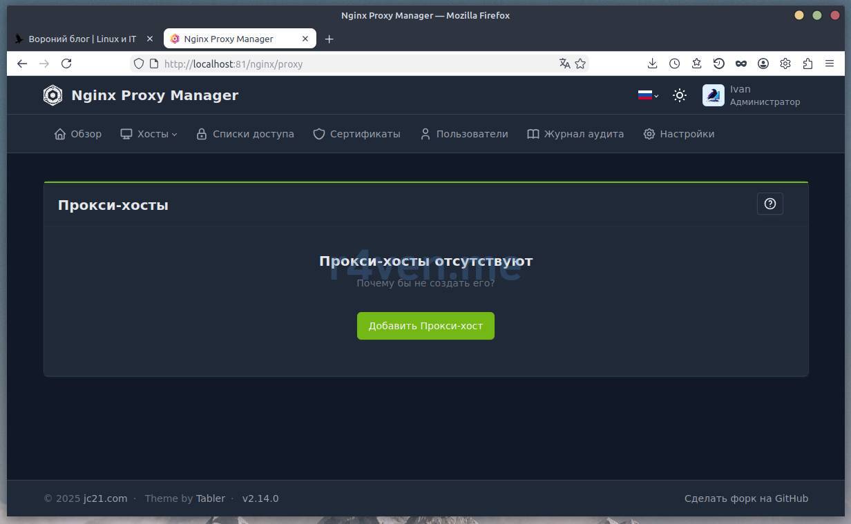 Самое время настроить проксирование. Идём в наш Nginx: “Прокси Хосты” –> “Добавить Прокси-хост”.
