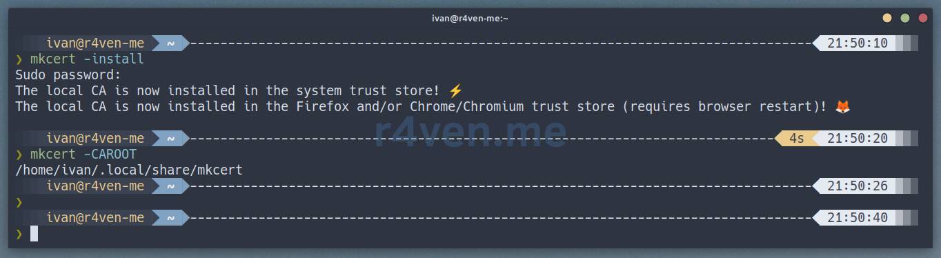 mkcert -CAROOTПервая команда создаёт локальный центр сертификации и добавляет его корневой сертификат в доверенные сертификаты на нашей системе и в хранилище установленных браузеров, например, Firefox и Chromium: