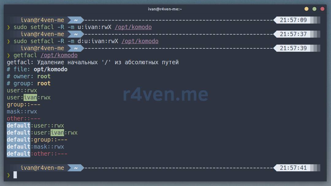 sudo setfacl -R -m d:u:ivan:rwX /opt/komodo