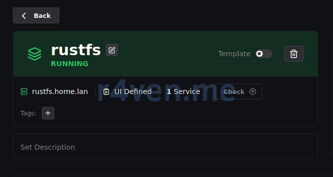 В целом наша лаборатория уже в рабочем состоянии и готова выполнять свои задачи. Давайте для примера добавим еще один стек, например, RustFS - S3-совместимное хранилище, которое выступает альтернативой печально известному MinIO.