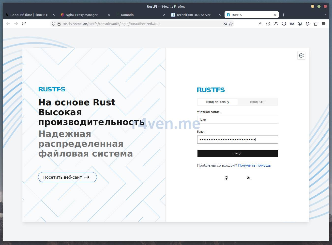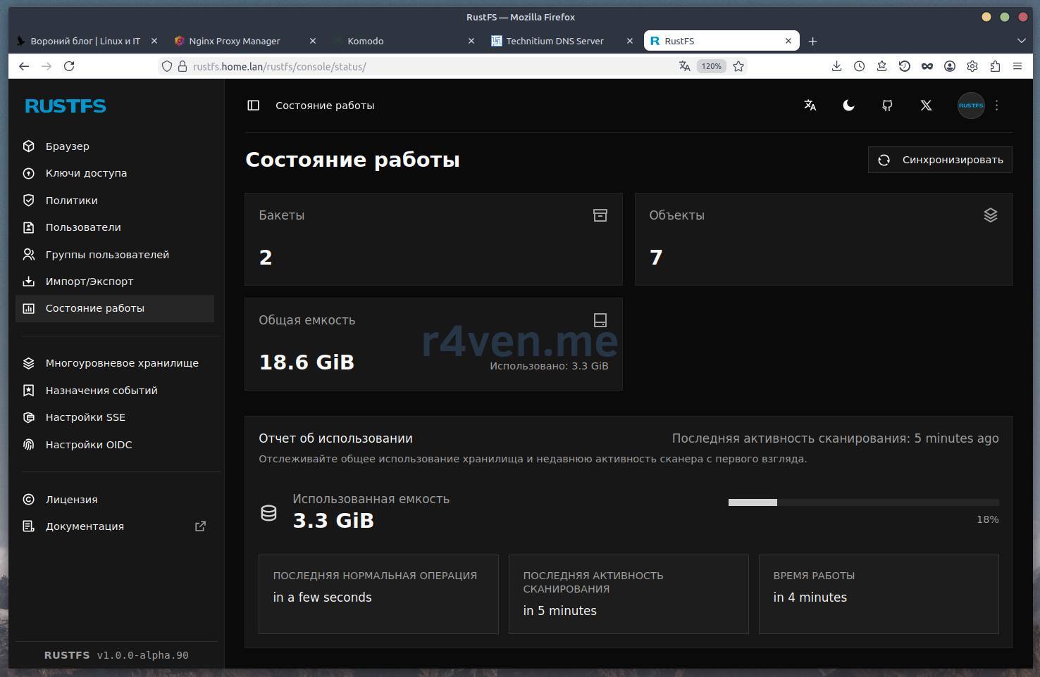 Переходим по https://rustfs.home.lan, вводим логин (RUSTFS_ACCESS_KEY) и пароль (RUSTFS_SECRET_KEY):