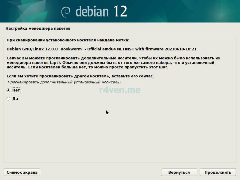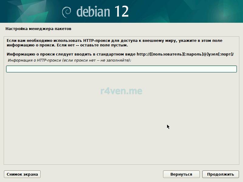 Через некоторое время мастер установки спросит о необходимости сканирования на наличие дополнительных источников ПО — оставляем «Нет». Далее указываем зеркало репозиториев дистрибутива Debian — указываем нужную страну и провайдера. При необходимости можно указать параметры для прокси сервера. Если таковой не используется — оставляем поле пустым и идём дальше: