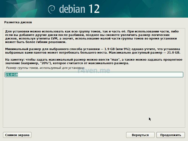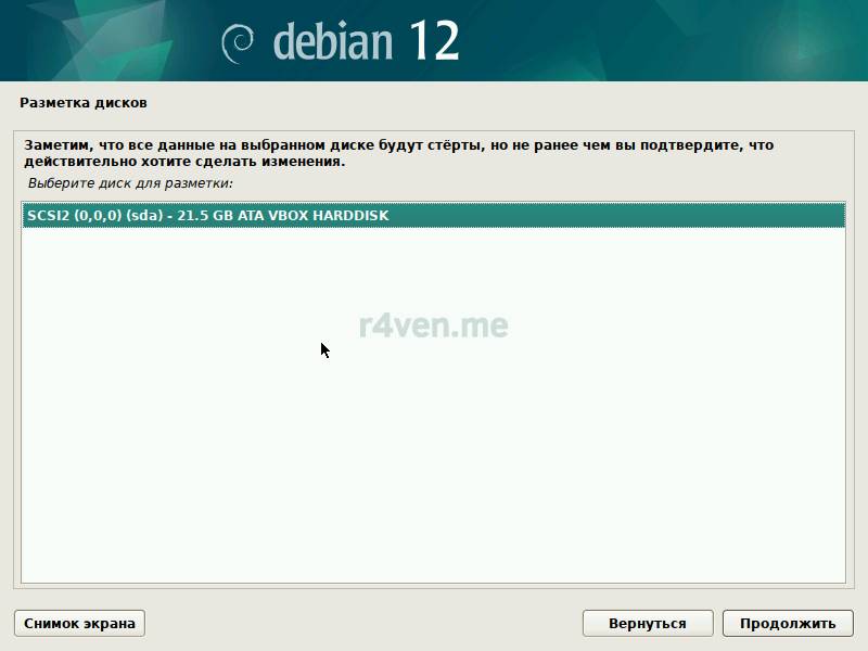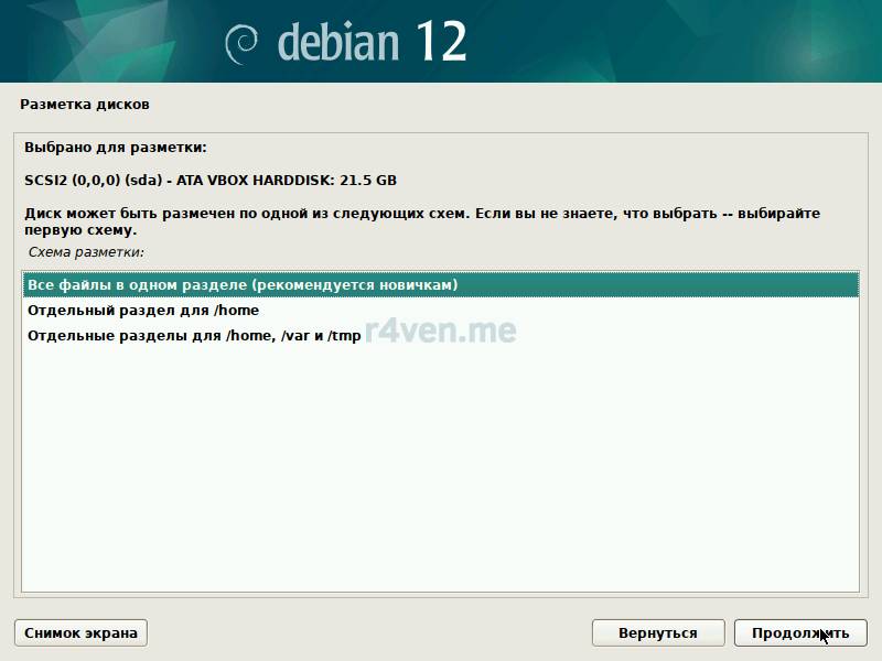 И переходим к разметке дискового пространства. Обычно разбивка диска является одним из непростых пунктов установки системы. Но только если вам нужны специфические настройки, по типу разбиения диска на несколько разделов конкретного размера, создание raid массивов и пр. К слову установщик Debian всё это умеет в графическом режиме, но данный вопрос также выходит за пределы данного поста.