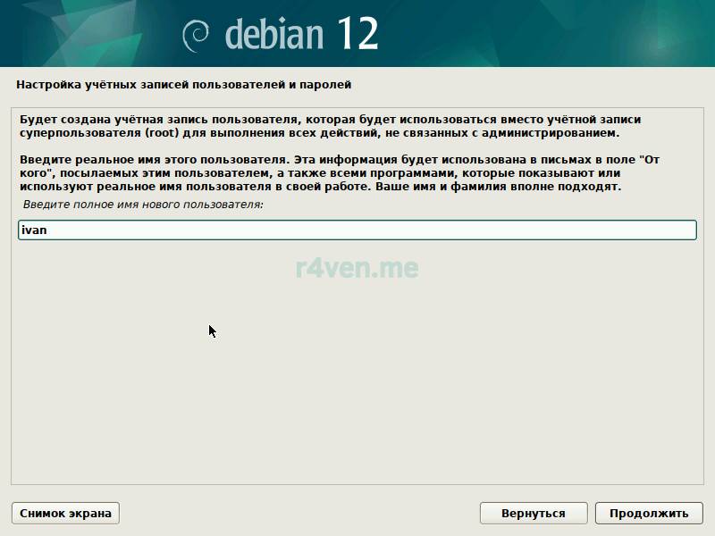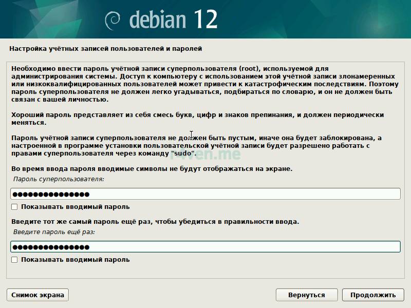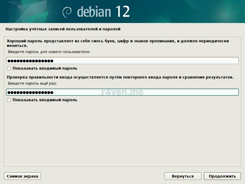 Теперь необходимо задать пароль для пользователя root, затем создать нового пользователя указав его имя и задав для него пароль: