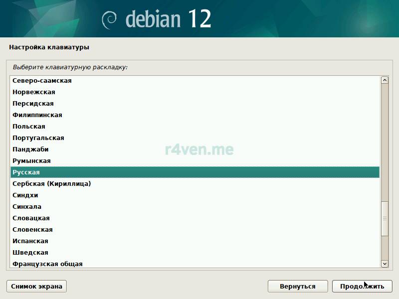 Выбираем Русский язык, местонахождение и раскладку клавиатуры, а также способ смены раскладки (по умолчанию Alt+Shift). Соответственно нажимаем Continue/Прололжить: