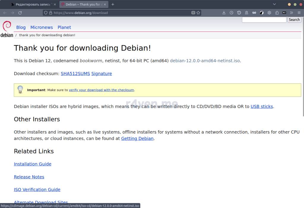 Прежде всего, нам необходимо скачать образ (дистрибутив) Debian 12 с официального сайта: https://www.debian.org/download. На указанной странице скачиваем, последний на данный момент, iso образ — debian-12.0.0-amd64-netinst.iso.