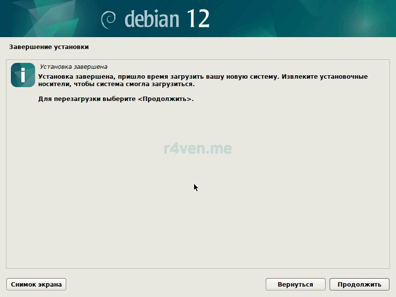 После установки загрузчика программа установки сообщит об завершении установки Debian 12 на нашу виртуальную машину. Нажимаем «Продолжить» и ВМ перезагрузится: