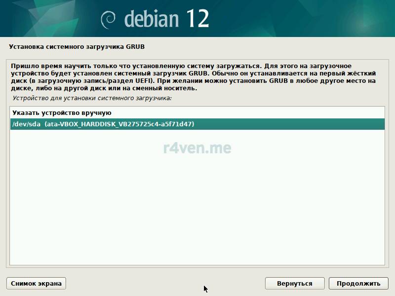 Финишная прямая. Каждую систему Linux запускает определенная программ-загрузчик. В Debian по умолчанию это загрузчик Grub 2. Т.к. у нас всего один дисковый накопитель — выбираем его, затем «Да», нажимаем «Продолжить»: