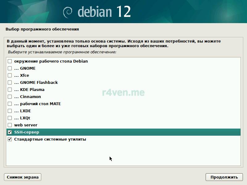 А этот шаг интересный — выбор программ для установки. Так как наша цель сегодня установить сервер без графики, из всего списка оставляем только два пункта: SSH-сервер и Стандартные системные утилиты (!!! окружение рабочего стола Debian — галочку убираем !!!):