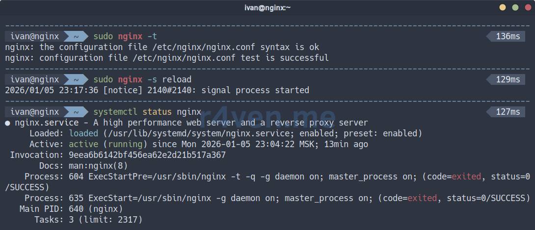 📝 Пример настройки из статьи выполнялся в среде дистрибутива Debian 13. Для установки Nginx выполните: