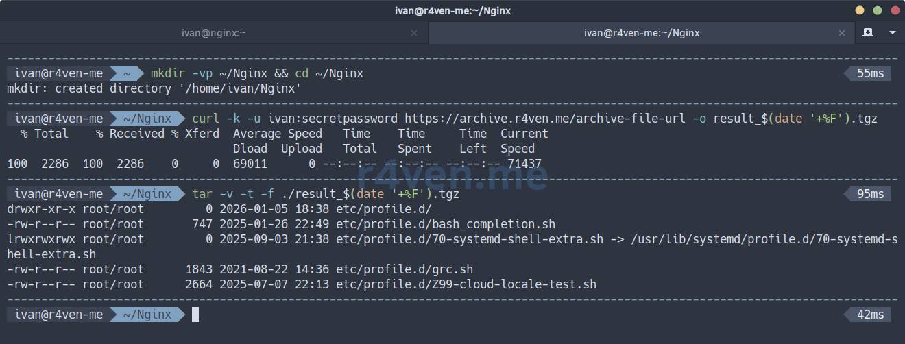 curl -k -u ivan:secretpassword https://archive.r4ven.me/archive-file-url -o result_$(date '+%F').tgz