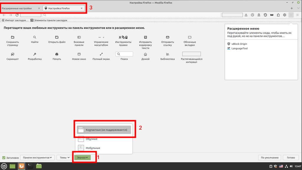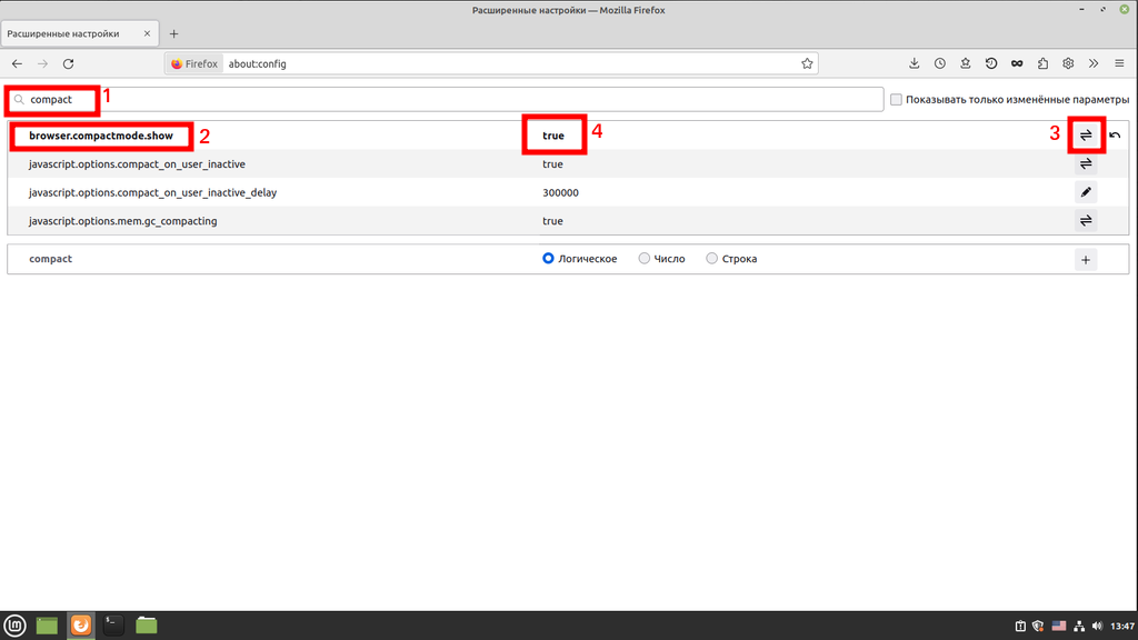 Не закрывая текущего окна включаем компактные вкладки. Пишем в поиске compactmode.show и меняем значение с false на true. После заходим в режим редактирование панели инструментов, как делали выше и включаем компактный режим (там написано не поддерживается, но всё поддерживается):