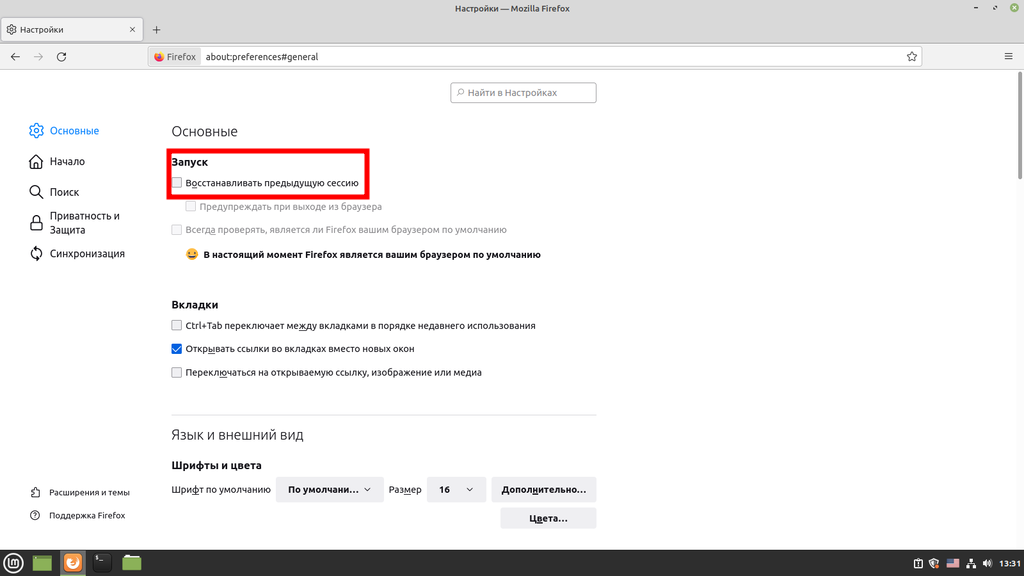 В разделе «Основные» убираем галочку с «Восстанавливать предыдущую сессию»: