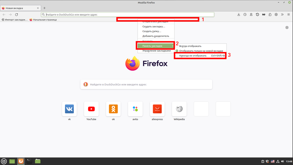 Осталось отключить панель закладок (если не пользуетесь) и начальная настройка браузера Firefox завершена: