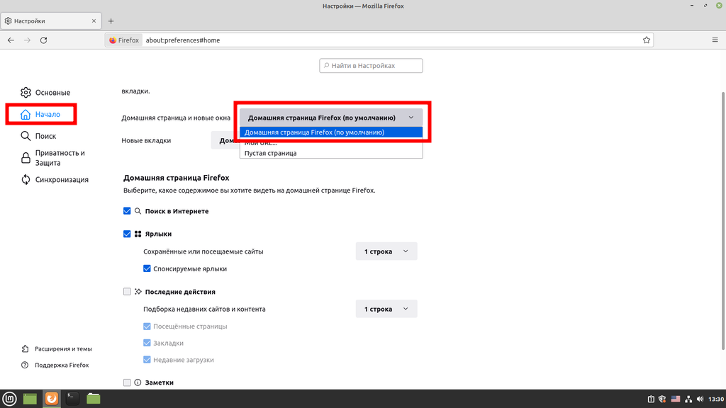 Далее переходим в раздел «Начало» выбираем домашнюю страницу для новых окон: