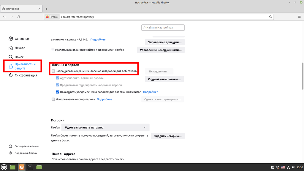 Следующим идет раздел «Приватность и защита». Тут мы отключаем запросы на сохранение логинов и паролей для веб сайтов.