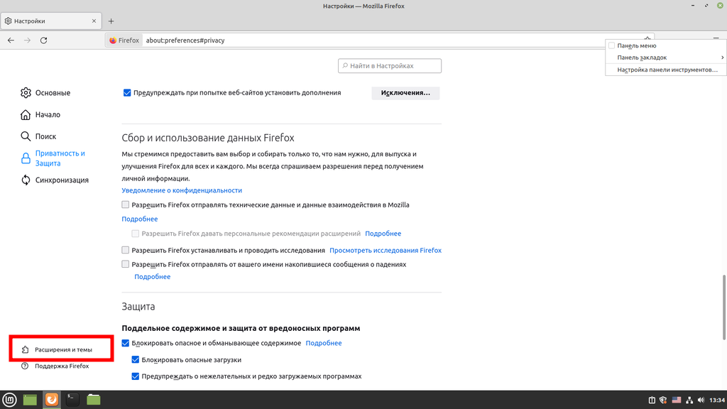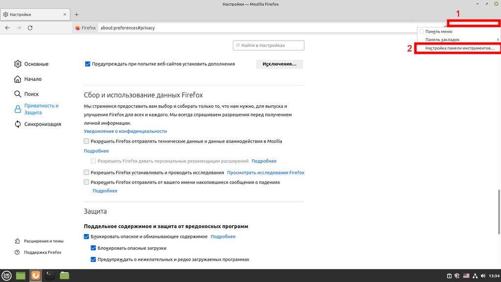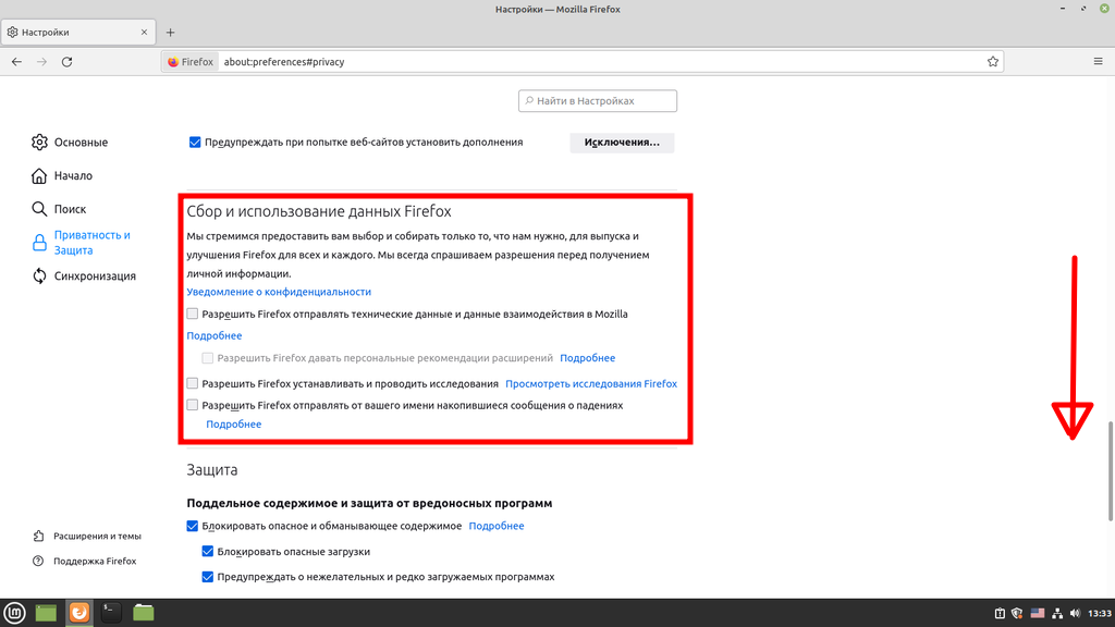 Также отключаем сбор и отправку телеметрии. Хоть и разработчики Firefox утверждают, что они собирают данные, не позволяющие персонифицировать пользователя по ним, я все же предпочитаю отключить этот пункт: