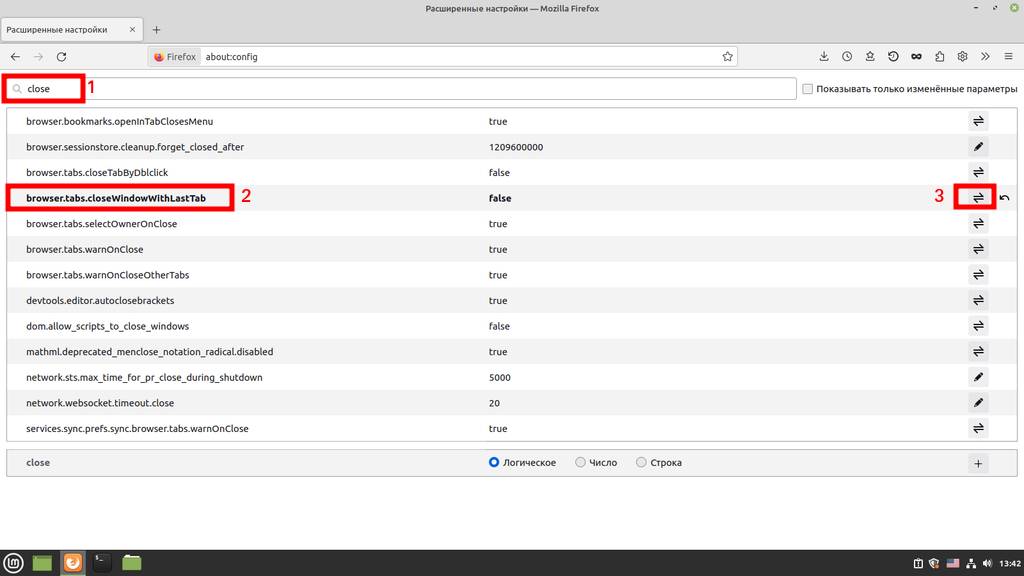 Далее отключаем завершение программы Firefox после закрытия последней вкладки. Для этого в поисковой строке пишем about:config, затем слово ищем пункт «closeWindowWithLastTab» и нажимаем на переключатель с true на false: