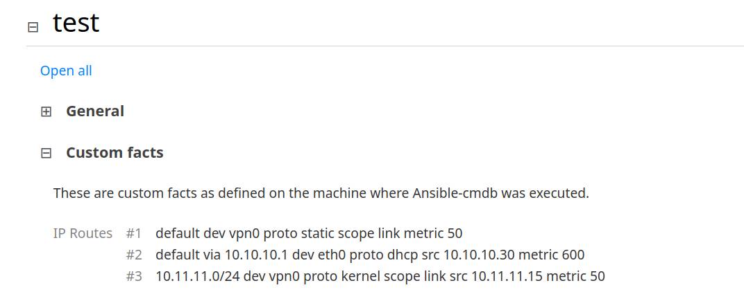 ansible-cmdbдля генерацииHTML; - Как добавить кастомные факты;