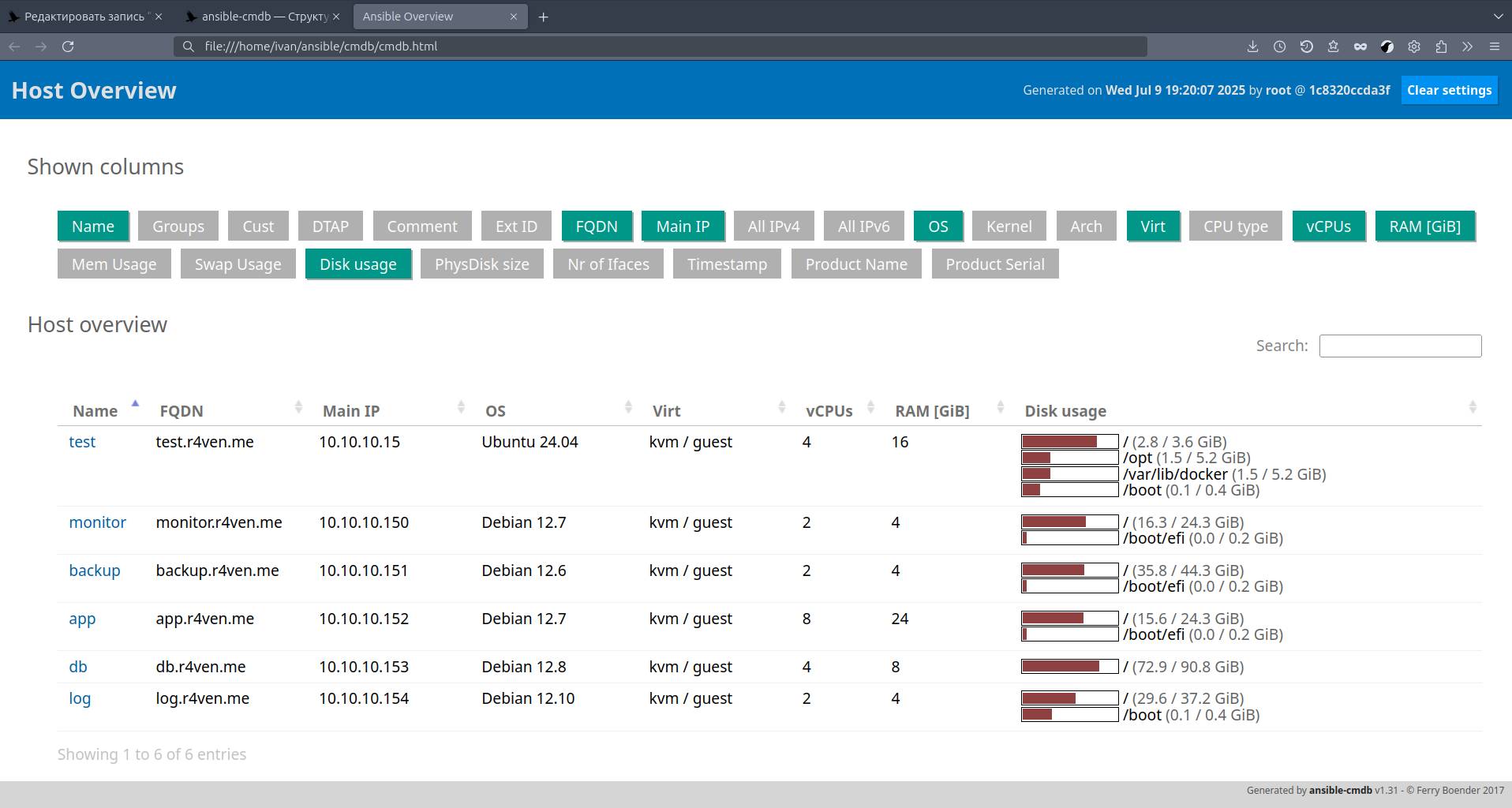 ansible -m setup --tree ./cmdb/facts/basic all &> /dev/nullТеперь с помощью ansible-cmdb генерируем HTML файл на основе собранных данных: