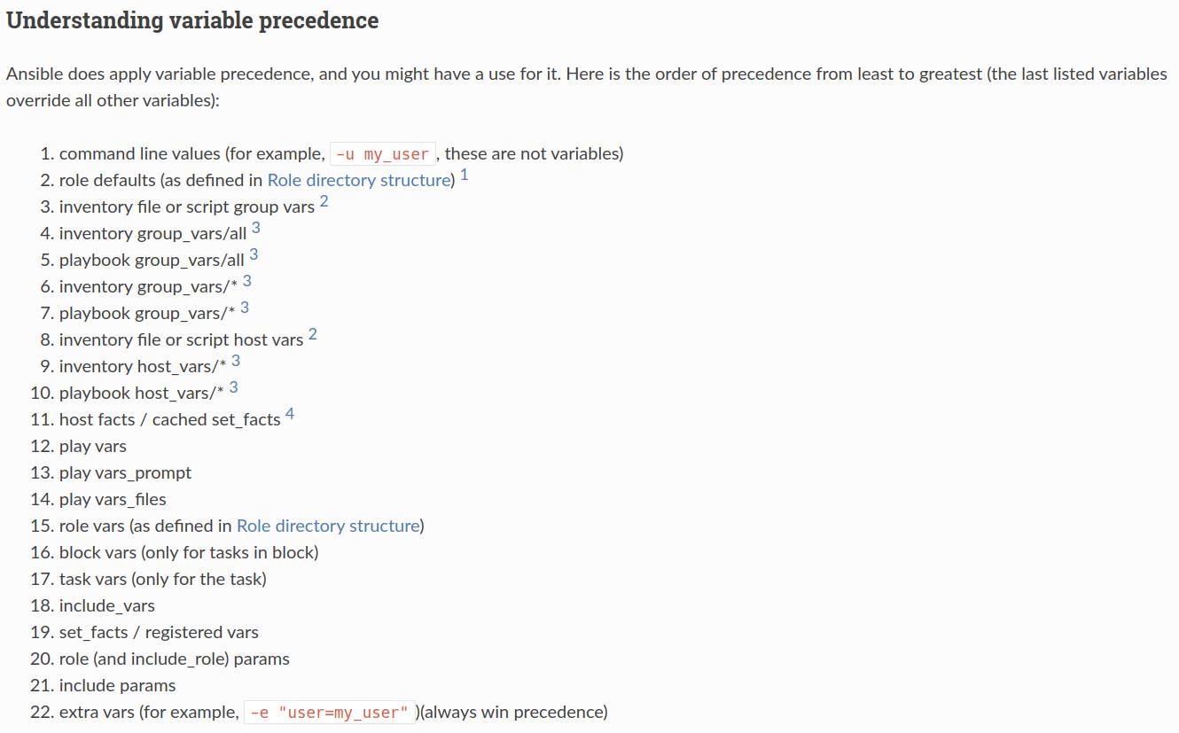 Как вы поняли, переменные в Ansible это отдельная тема, про которую лучше меня расскажет оф. документация. Я лишь укажи на самое проблемное место — переопределение переменных. В Ansible для них существует вот такая иерархия (нижние переопределяют верхние):