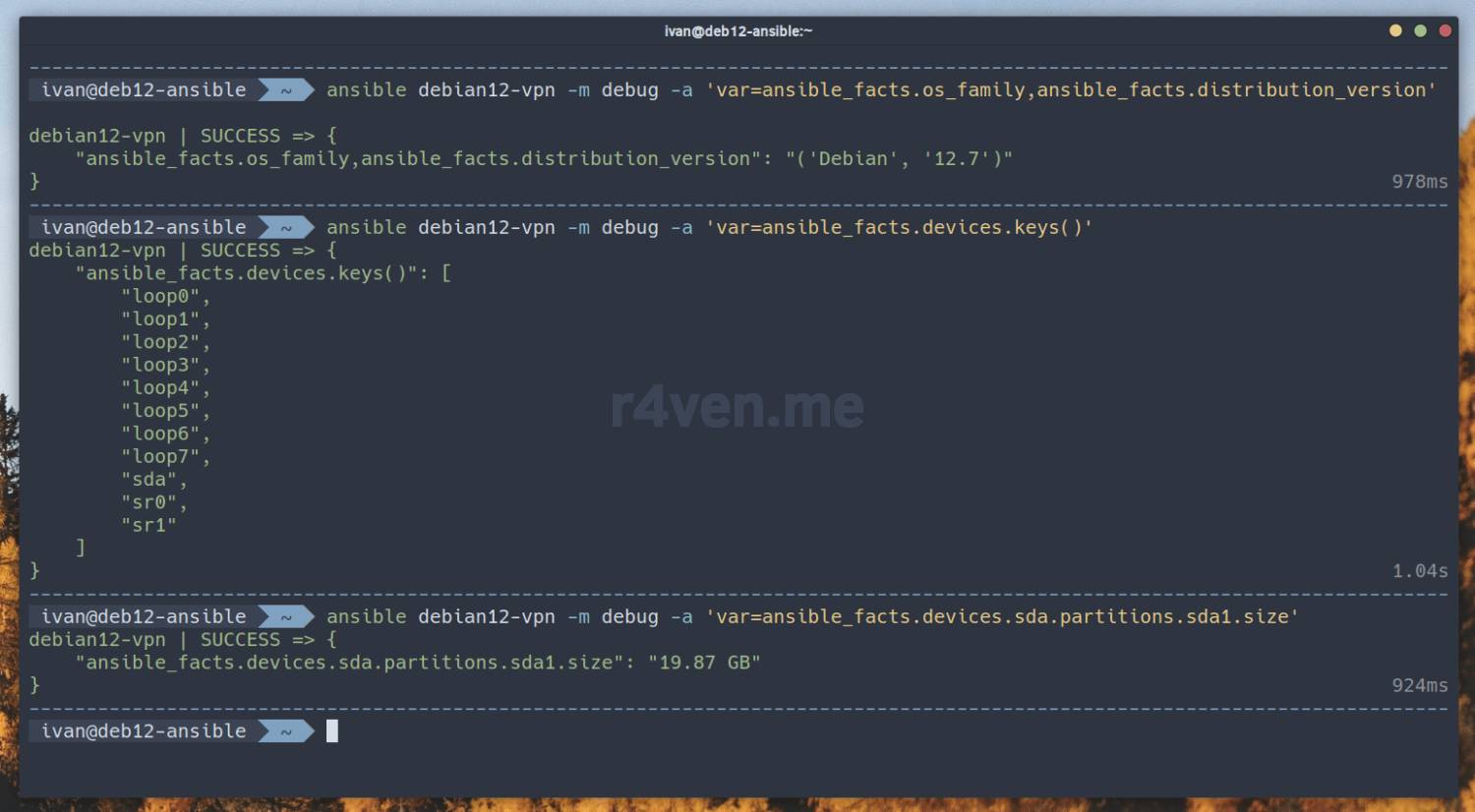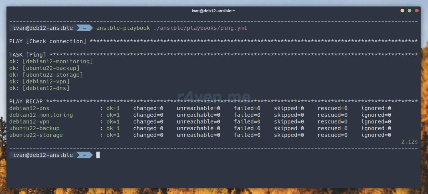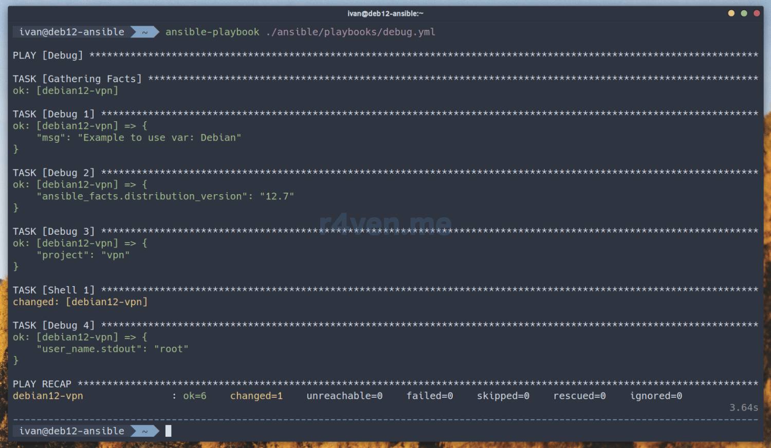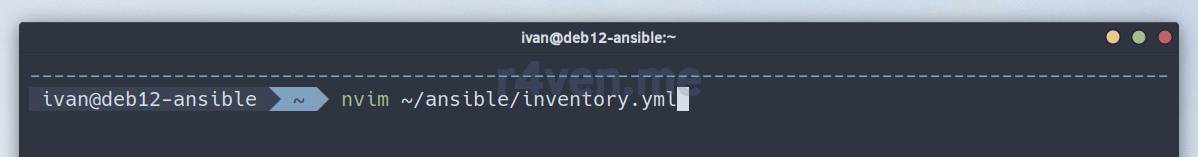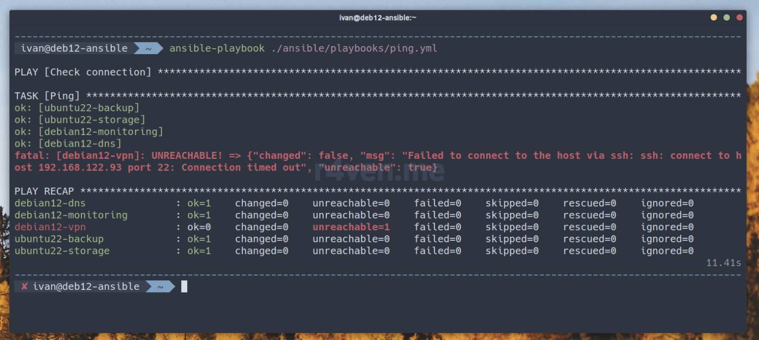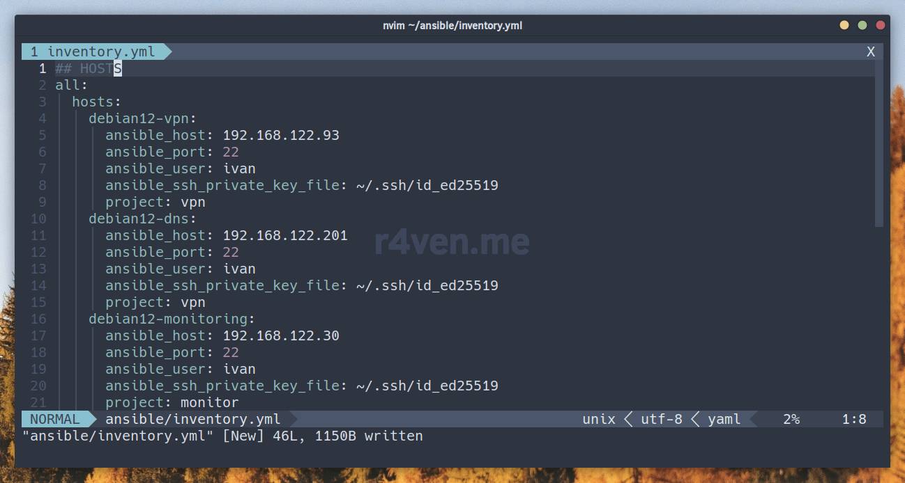 debian12-vpn— произвольное имя хоста в файле инвентаризации;ansible_host: 192.168.122.93— адрес хоста (IP или DNS);ansible_port: 22— порт подключения SSH;ansible_user: ivan— пользователь SSH, с помощью которого выполняется подключение;ansible_ssh_private_key_file: ~/.ssh/id_ed25519— путь до приватного SSH ключа (переопределяет значение изansible.cfg);- Нежелательная альтернатива: