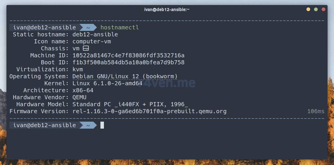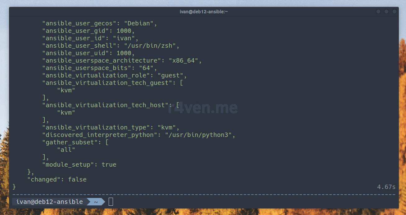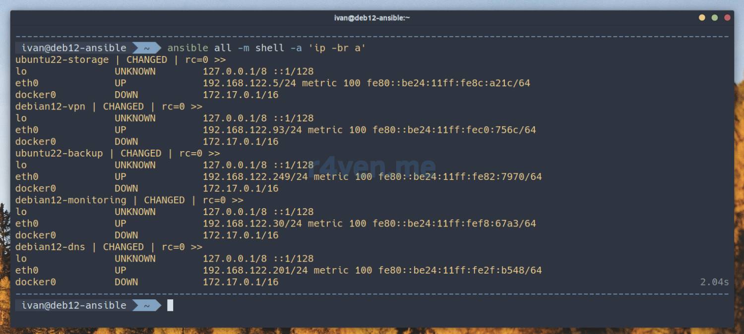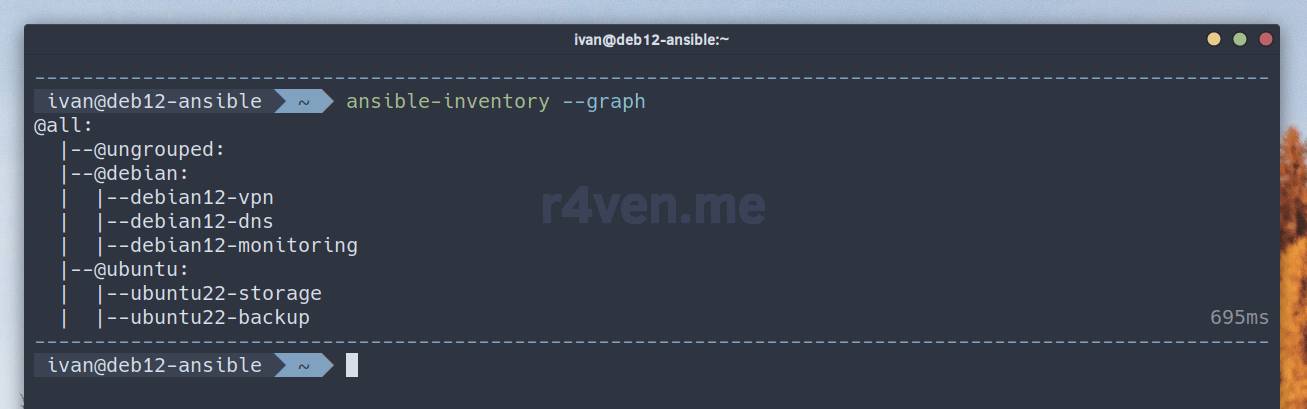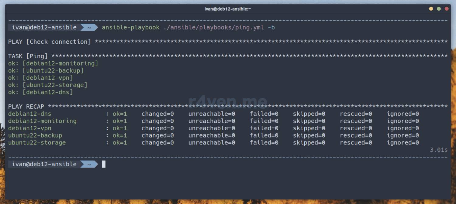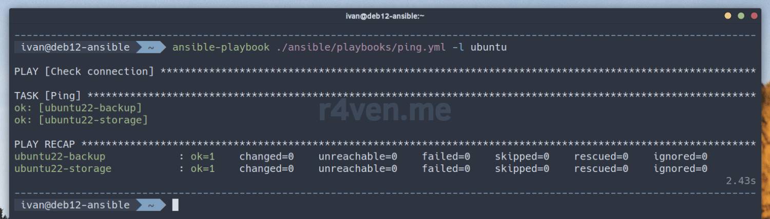 debian12-vpn— произвольное имя хоста в файле инвентаризации;ansible_host: 192.168.122.93— адрес хоста (IP или DNS);ansible_port: 22— порт подключения SSH;ansible_user: ivan— пользователь SSH, с помощью которого выполняется подключение;ansible_ssh_private_key_file: ~/.ssh/id_ed25519— путь до приватного SSH ключа (переопределяет значение изansible.cfg);- Нежелательная альтернатива: