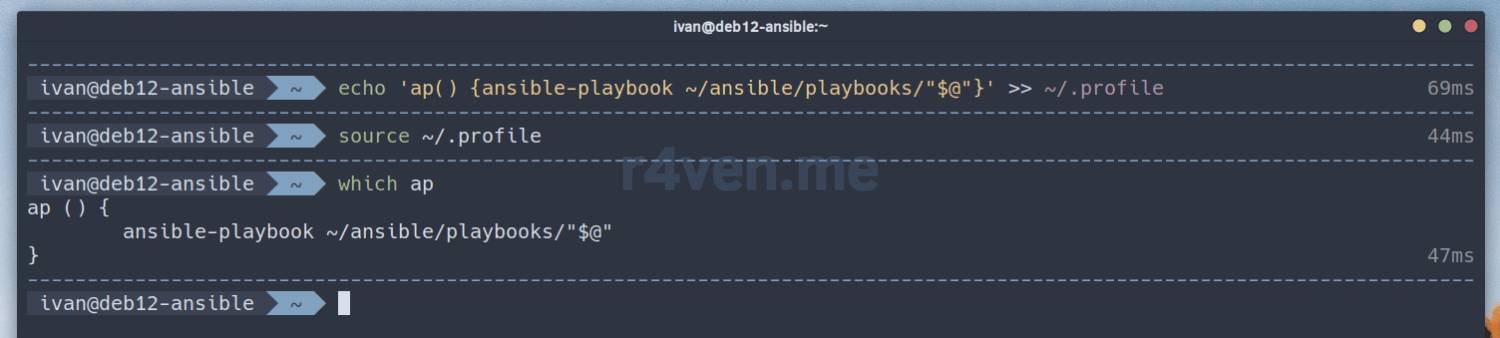 echo 'ap() { ansible-playbook ~/ansible/playbooks/"$@"; }' >> ~/.profile
