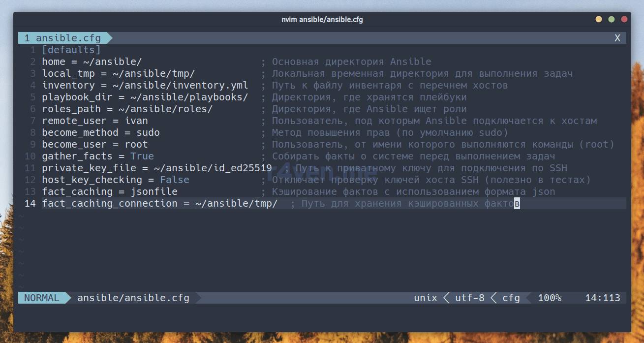 Такой конфигурации достаточно, чтобы начать использовать Ansible👍. Этот файл определяет поведение Ansible по умолчанию, которое может быть переопределено в других местах: файлах инвентаризации, плейбуках, файлах переменных, командах или в других конфигах.