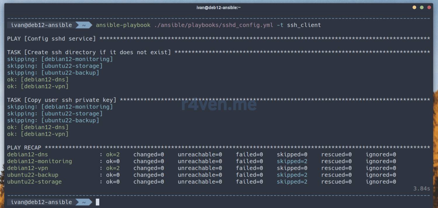 Возможно вы обратили внимание🧐, что в плейбуке используются теги🔖. С их помощью можно осуществлять выборочный запуск. Например, выполнить только те задачи, которых есть тег ssh_client (ключ -t или --tags):
