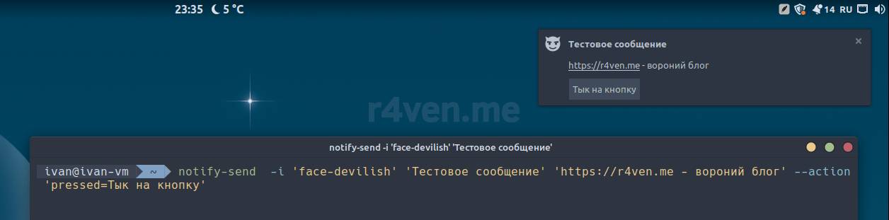 notify-send -i 'face-devilish' 'Тестовое сообщение' 'https://r4ven.me - вороний блог' --action 'pressed=Тык на кнопку'