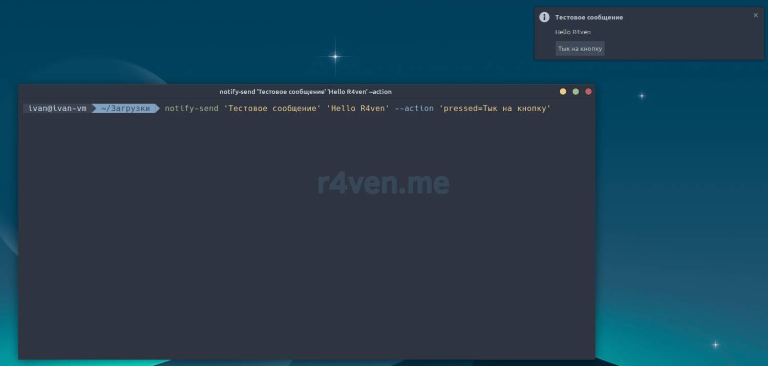 notify-send 'Тестовое сообщение' 'Hello R4ven' --action 'pressed=Тык на кнопку'