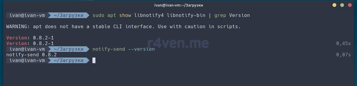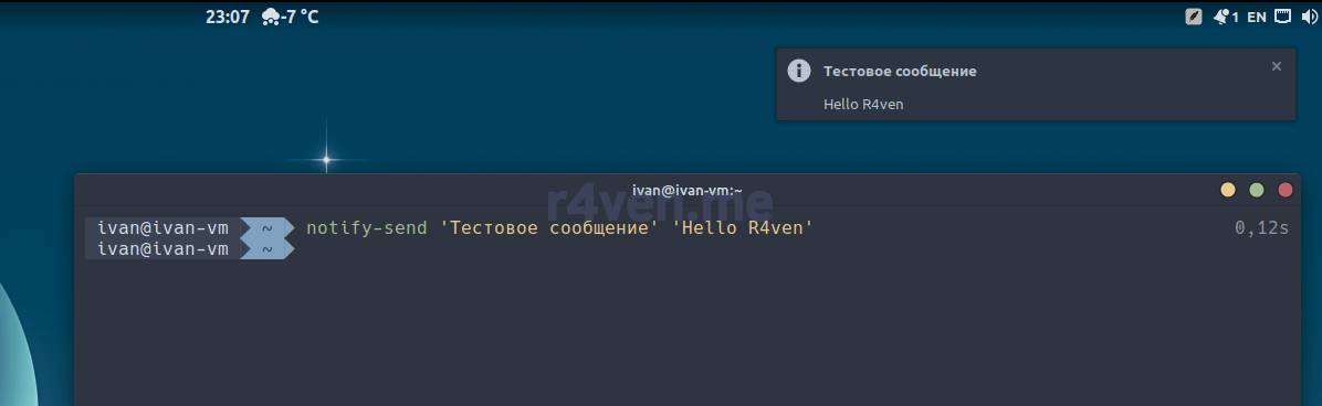 notify-send 'Тестовое сообщение' 'Hello R4ven'