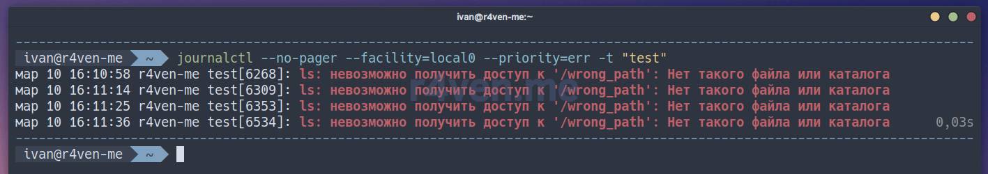 journalctl --no-pager --facility=local0 --priority=err -t "test"
